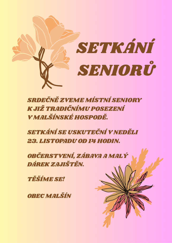 Obec Malšín srdečně zve všechny místní seniory na tradiční setkání, které se bude konat v Malšínské hospodě. Toto posezení je naplánováno na neděli 23. listopadu od 14 hodin. Pro všechny účastníky bude zajištěno občerstvení, zábava a malý dárek. Přijďte strávit příjemné odpoledne v příjemné společnosti a užít si společné chvíle.